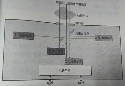 如上圖所示,這是一種采用了通過加熱反射鏡面來減少濕度對氣體傳感器檢測精度影響,雙光路的設(shè)計降低靈敏度變化的紅外傳感器。其所有檢測電路、光源和檢測器都被放置在真空密封的一個空間里面,避免了這個氣體檢測儀測量結(jié)果不會受到環(huán)境中灰塵和濕度的影響。所有參比光束和檢測光束都要通過一個窗口來進(jìn)入開放式氣體檢測室,再通過鏡面反射進(jìn)入窗口,完成兩次吸收后光束再回到密封光路中,最后再計算可燃?xì)怏w的濃度。需要 注意的是,這個設(shè)計中的窗口和反射鏡采用的加熱設(shè)計是為了防止檢測結(jié)果受到環(huán)境中的濕度影響。